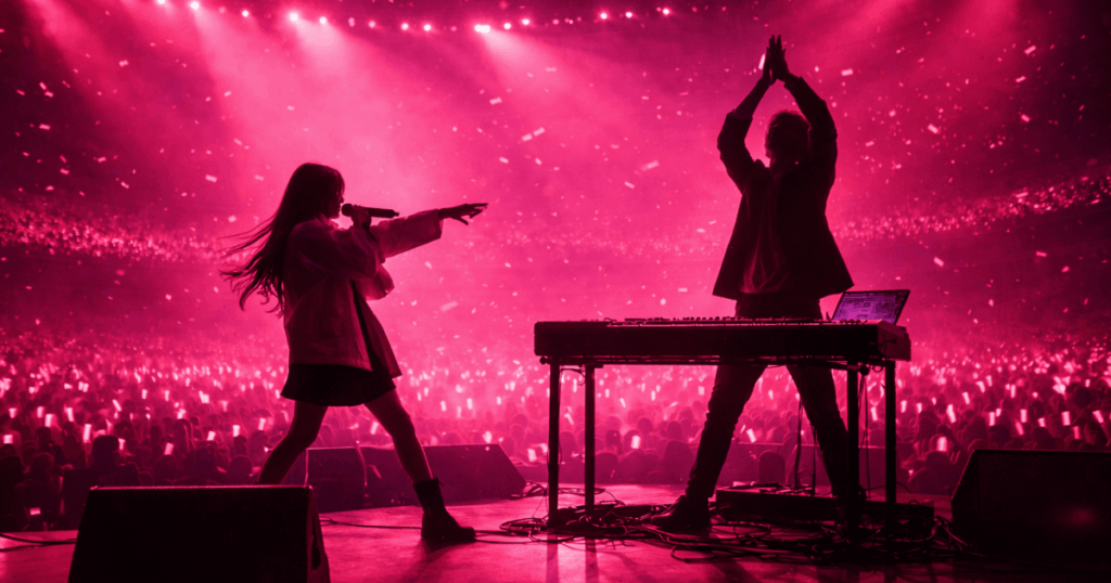 YOASOBIのライブを思い返すと、記憶に残るのは曲名より先に「空気が切り替わった瞬間」だったりする。音が鳴っただけで客席の姿勢が変わる。照明の色が変わっただけで、呼吸の速さまで揃う。その切り替えを何度も作っていたのが、今回まとめたYOASOBIのライブのセトリ定番曲20曲だった。残るのは“曲名”じゃなく“空気の変化”だ。