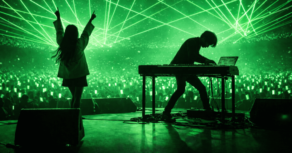 YOASOBIのライブは、曲を知っているだけじゃ足りない。音が鳴った瞬間、会場の空気が切り替わって、身体が先に反応する。赤いレーザーが走って拳が揃う。青い光が広がって声が重なる。タオルが回り、フリフラの色が増えて、景色が一気に塗り替わる。逆に、歓声が跳ねるんじゃなく、呼吸だけが揃う静けさが落ちて、会場が物語の中へ沈んでいく瞬間もある。YOASOBIのライブは、その変化がはっきり見える。だから、終演後に残るのは 「あの瞬間の温度」 だったりする。フェスだと、隣の知らない誰かと同じ合図で一気に揃う瞬間があって、その“揃い方”がまた気持ちいい。